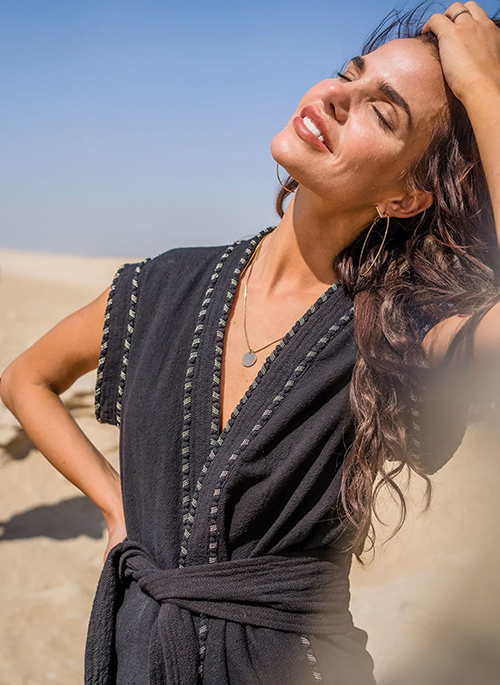 The softly tailored yet structured cut and overlapping closure radiates an edgy, relaxed and confident vibe. VICTORY has a detachable belt and beautiful hand embellished borders adding to a premium summer look for any special occasions. For the ultimate resort look, team it up with the matching VICTORIA shorts. The two of them together out beat any other summer outfit and is unforgettable.