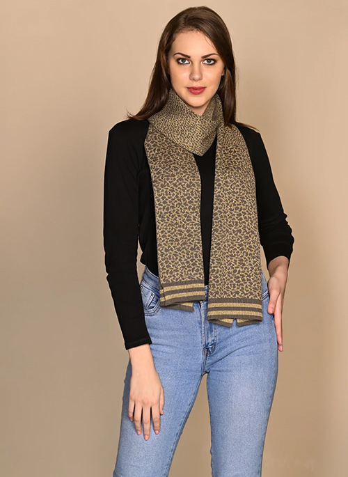 This dark olive and frappe cotton, viscose and polyestor blended jacquard scarf in a leopard design with dark olive and frappe lurex stripes at the ends is a trendy and playful accessory for everyday styling with any casual wear.