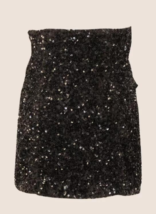 Black asymmetrical mini skirt in micro-sequined fabric with faux buttoning on the front, front flap pocket and side zip closure. Head designed and made entirely in Italy.