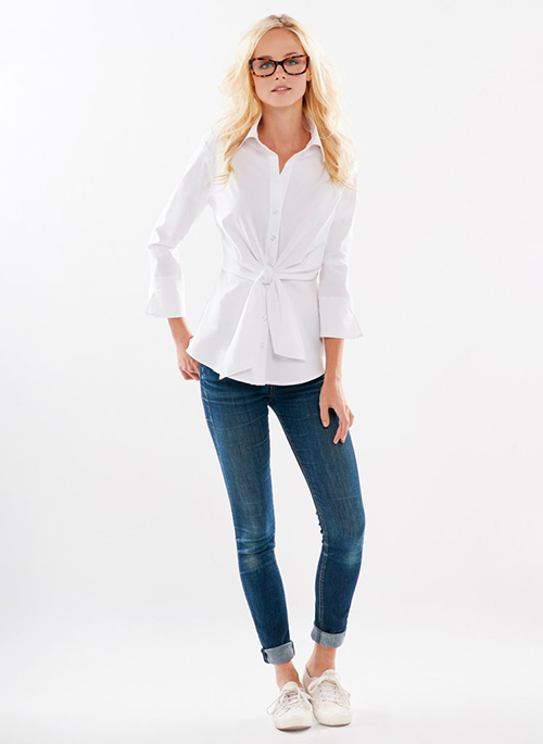 Our "Walter" shirt flatters every shape with it's "easy does it" fit. Crisp, woven stretch cotton Button front, ties at waist, 3/4 sleeve, turnback cuff 60% Cotton / 35% Polyester / 5% Spandex Fitted shape Hand or machine wash Made in USA