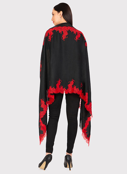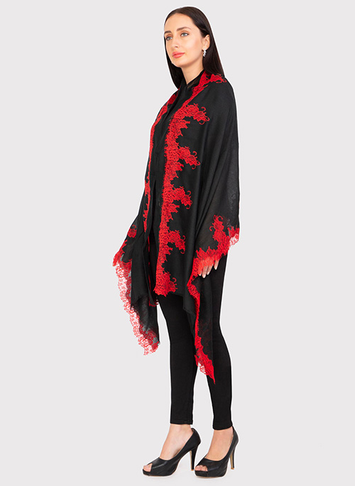 This tomato red scarf, woven from a fine blend of silk and wool, is bordered and hand appliqued with a contrasting and fuchsia delicate leaf-patterned lace. It is the perfect size that keeps you comfortably warm whilst making for a fashionable and contemporary accessory for any time wear.