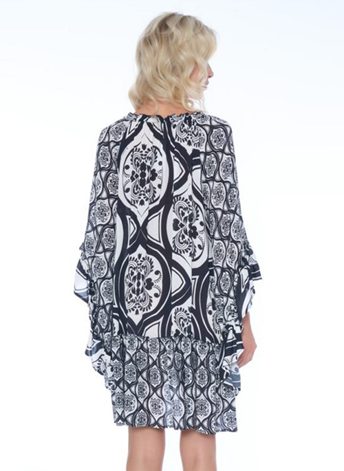 The sophistication of black and white mixes with the elegance of the design, creating a soft caftan with wide sleeves. Made of viscose and enriched with flounces and tassels, the model is asymmetrical and with a very feminine deep neckline.
