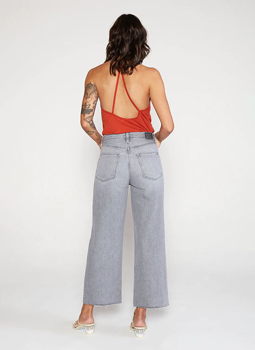 An all-season favorite in an organic cotton/tencel blend denim. Fit is snug in the rear, easy in the thigh and wide all the way down to a cropped raw hem.
