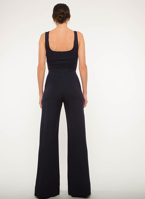 Wide leg ponte knit tank jumpsuit made from ponte knit. Perfectly fitted bodice and exaggerated wide leg are elongating on all body types. The ponte fabric gives the appearance of a structured look with all the comfort of a soft knit.
