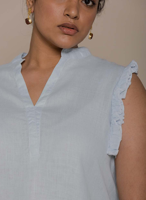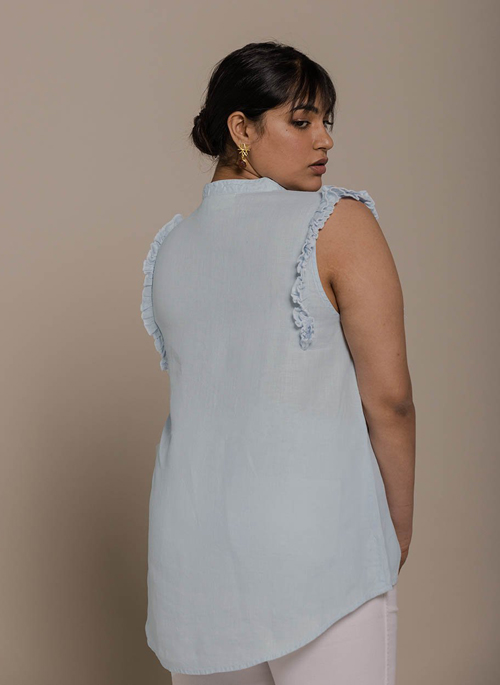 With its stylish Mandarin V-neck collar, this versatile ruffle sleeveless top has a flirty and flattering cut to suit all body types.