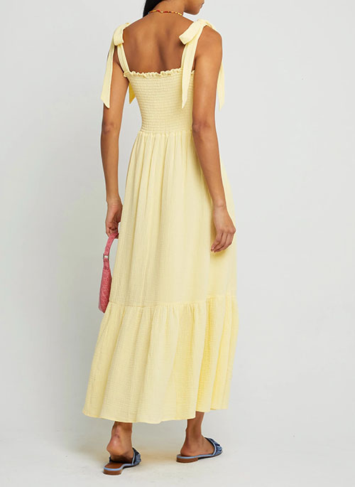 Easy and breezy, this dress is done with a smocked bodice and tiered skirt. Airy 100% cotton and feminine ties at the shoulder finish this gorgeous look.