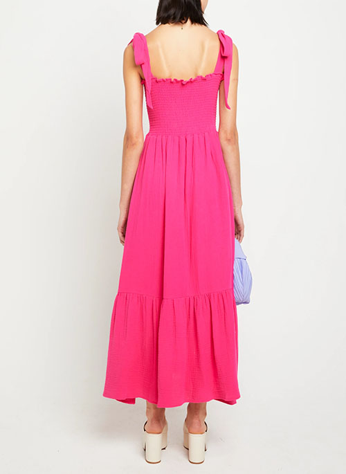 Easy and breezy, this dress is done with a smocked bodice and tiered skirt. Airy 100% cotton and feminine ties at the shoulder finish this gorgeous look.