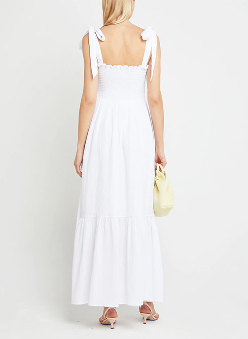 Easy and breezy, this dress is done with a smocked bodice and tiered skirt. Airy 100% cotton and feminine ties at the shoulder finish this gorgeous look.