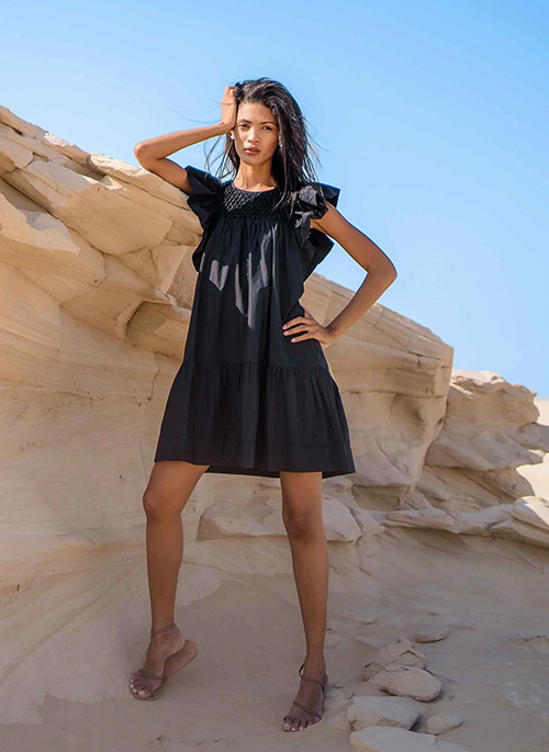 Our playful short length dress is adorned with a beautiful smock embroidered yoke made by hand. This beauty features a ruffle around the sleeve with hole embroidery and the dress is cut from a crispy cotton poplin to maintain the right oomph and volume. A versatile summer classic, ever so feminine.