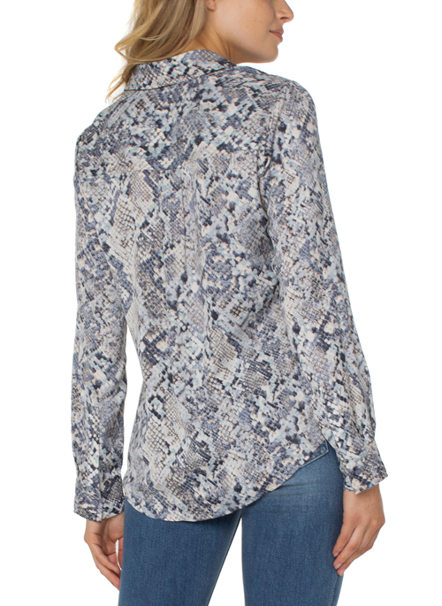 This abstract snake printed blouse is a fabulous statement piece with beautiful silver and blue hues. Pair it with trousers for the perfect workwear or wear it out on the town with denim and heels for an elevated chic look!