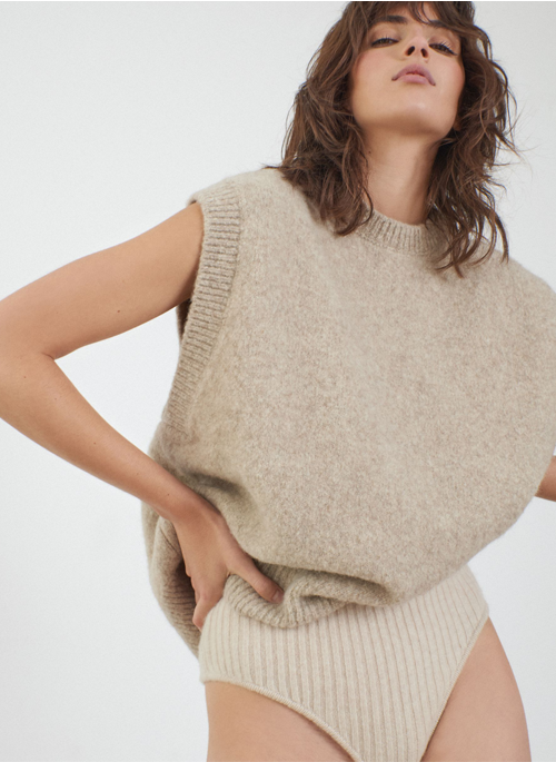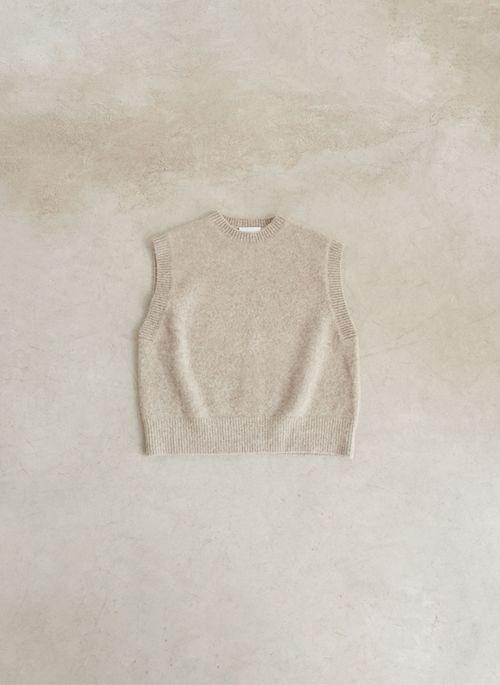 Versatile vest spun from responsibly sourced Yak-Alpaca blend from the plateaus of Himalayas mountains. With a slightly loose silhouette, it’s designed with a round neckline and flared-out shoulders, both outlined in wide, ribbed trims