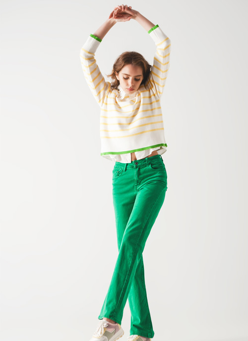 NEW STRIPE SWEATER IN YELLOW & WHITE Details: 43% Viscose 38% Polyester 18% Polyamide. Model is wearing size S. Model is: 33-23-35 Height: 5'10''. Runs true to size. Regular Fit. Style Nº: 5281425.