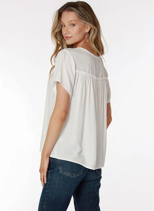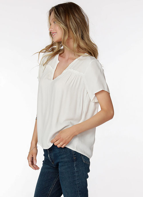 This day to night blouse is the perfect transitional piece. This top features a deep V neckline, front yoke smocking details, flutter sleeves, and a flowing hem. Dress up or down with the perfect combo of jeans and heels.