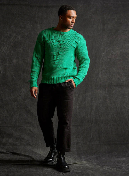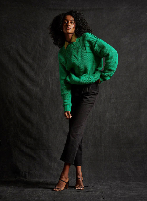 Our oversized wool-blend sweater features an allover ball knit heart pattern, mock neck, ribbed trim, and long dropped sleeves. Cable-stitched letters create tonal, textural interest with the discreet Áwet victory message throughout
