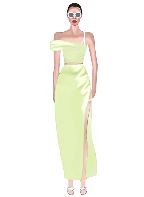 This set is cut from soft white satin with the brand's signature pearl details one shoulder. The pearl detail on the skirt gives it an extra chic look. Complete your dinner/party-ready look with chunky earrings for an iconic look.