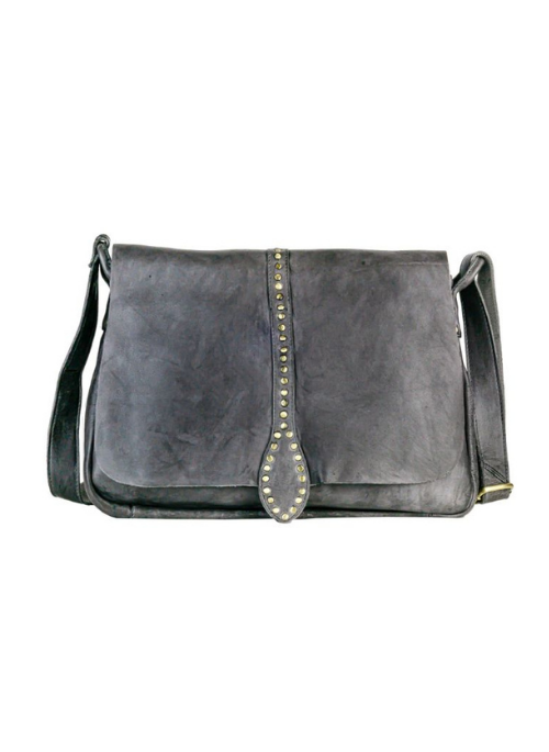 This bag is in piece dyed natural cowhide leather - the line is made in cowhide leather and characterized by particular processing of broken studs that create a leaf shape design - lined inside pockets both open and zippered - removable adjustable shoulder strap in leather